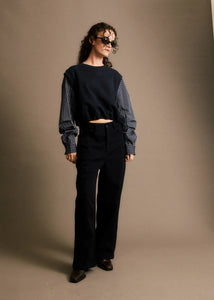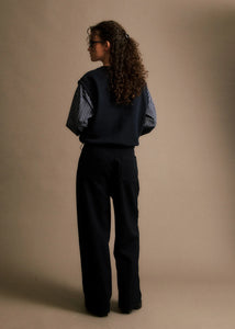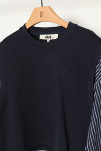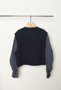 This elegant blue and white sweater combines a soft cotton sweatshirt with a refined long-sleeve shirt design. Featuring a contrasting collar and shoulders, it offers subtle visual interest while maintaining a polished look. The striped sleeves end in buttoned cuffs, adding a tailored finish. Enhanced by an exclusive JIJI Studio print, this piece balances comfort with sophisticated style for a versatile wardrobe essential.